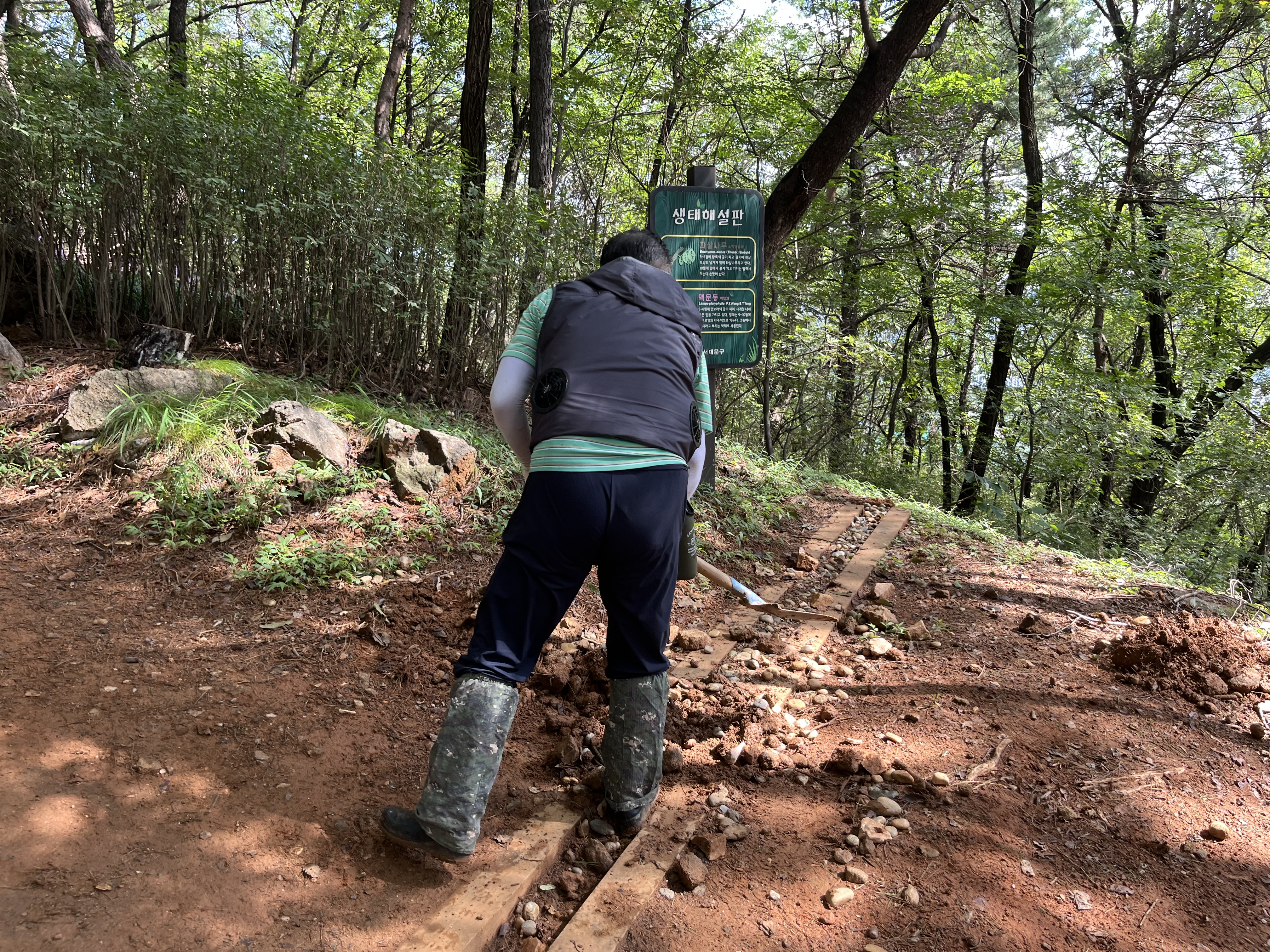자갈을 채워놓은 배수로는 자갈과 흙을 같이 퍼내고 다시 자갈을 채워넣는 힘든 과정을 거쳐야 함. 빗물에 쓸려내려오는 흙으로 채워지지 말라고 자갈을 채워넣은 것이 오히려 더 쉽게 흙으로 메꿔지고 보수과정도 훨씬 힘들어 보였음.