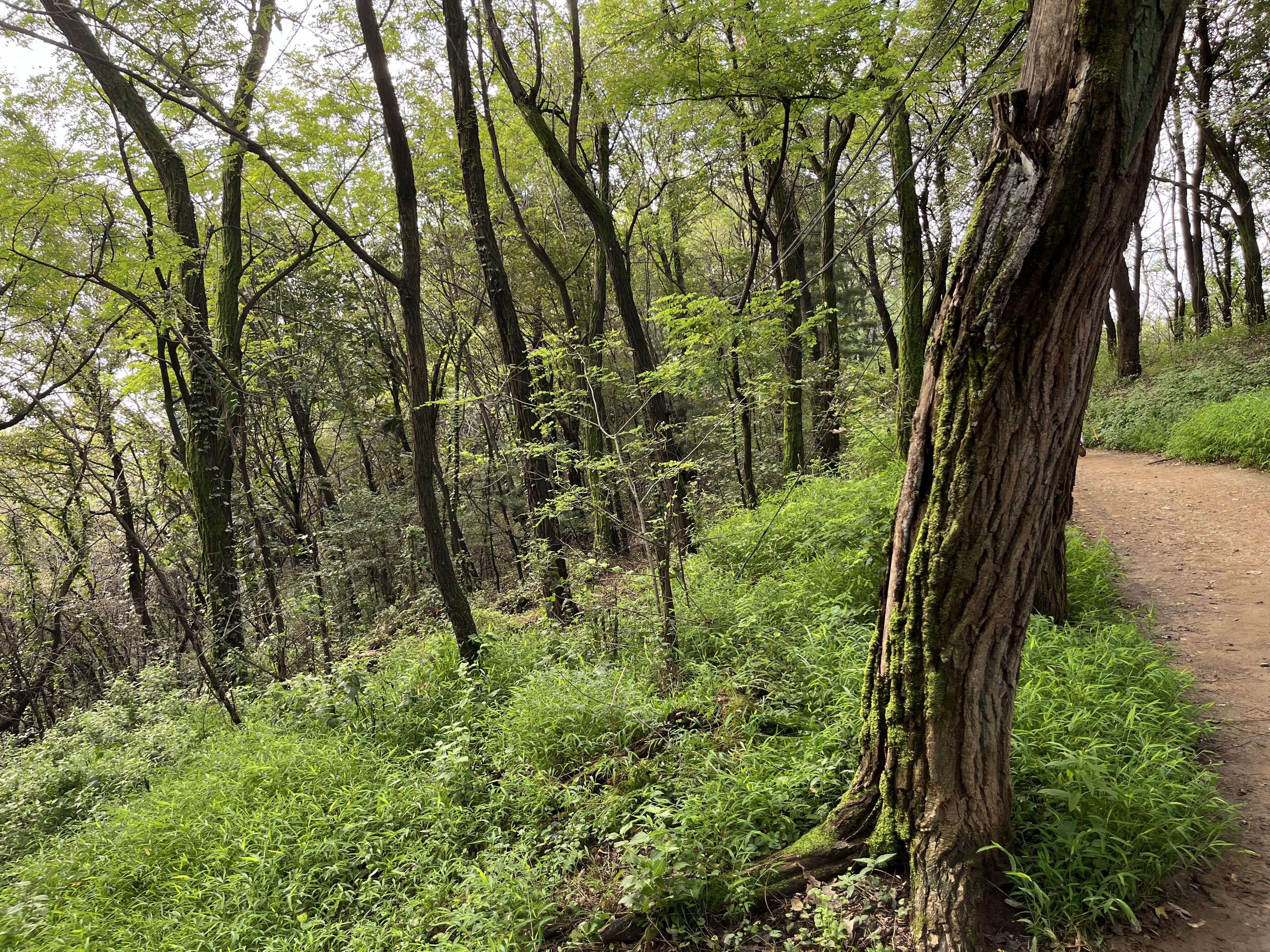 아까시(아카시아) 나무들이 서서히 죽어가서 무슨 문제가 있나 했는데, 전문가의 자문을 구한 바 현재 천이 중인 숲임이 확인되었습니다. 자연스럽게 그 수명을 다하고 작은 덤불들과 아기 나무들이 자라면서 새로운 순환 단계를 맞이하고 있는 중입니다.